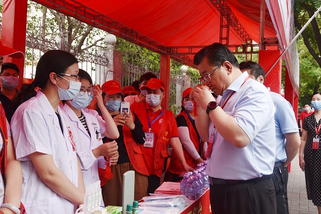 “这个好,有咱亳州中医药的特色!”在亳州一中考点,市长杜延安打开我院自制的中药香囊闻了闻,告诉现场的志愿者。