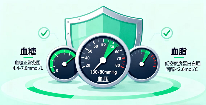 1.控好“三高”是基础:严格遵医嘱吃药,把血糖、血压、血脂控制在目标范围内。比如空腹血糖尽量控制在4.4-7.0mmol/L,血压不超过130/80mmHg,低密度脂蛋白胆固醇(“坏胆固醇”)控制在2.6mmol/L以下(高危人群需更低)。