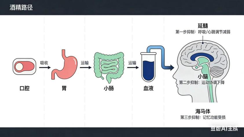 许多人以为,醉酒只是暂时的意识模糊,睡一觉就好。事实远非如此简单。当你举起酒杯,酒精从口腔进入体内,大约20%在胃部被直接吸收,其余进入小肠被迅速吸收进入血液。这些酒精分子随血液流遍全身,它们能轻易穿过血脑屏障,直接作用于中枢神经系统,抑制大脑功能。