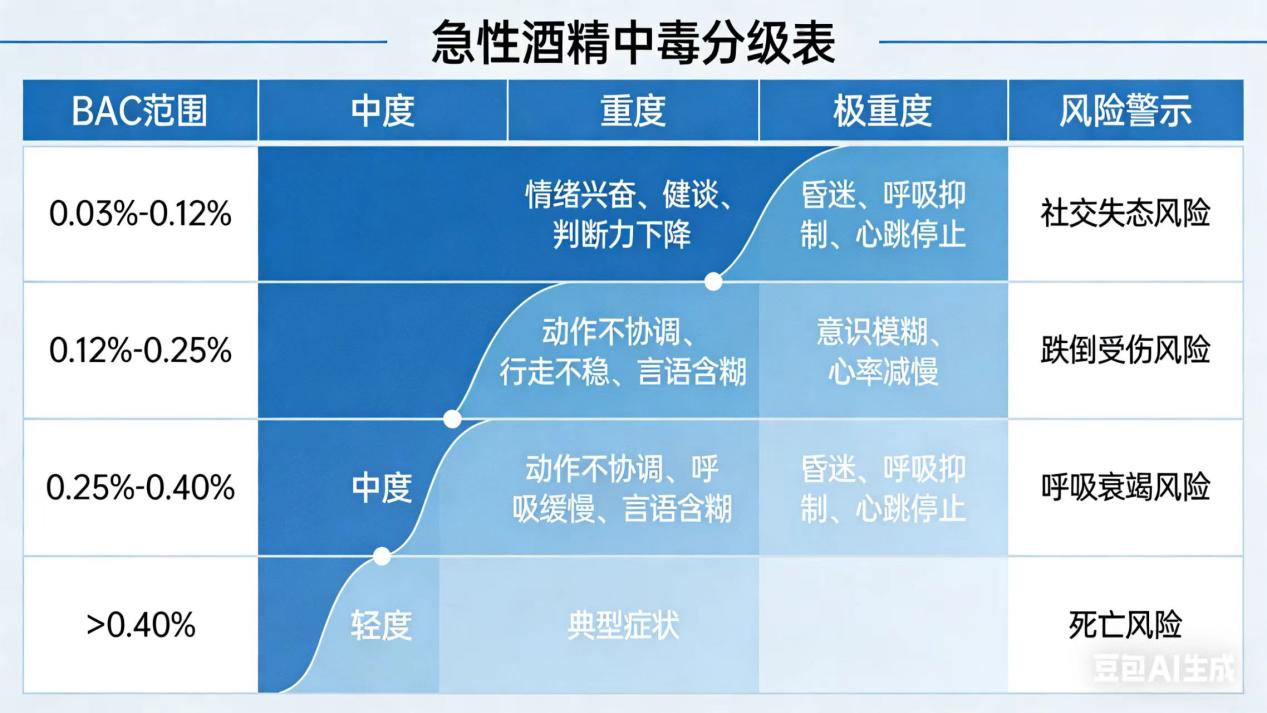 极重度中毒(昏迷期,BAC>0.45%):深度昏迷、呼吸循环衰竭,可致死亡