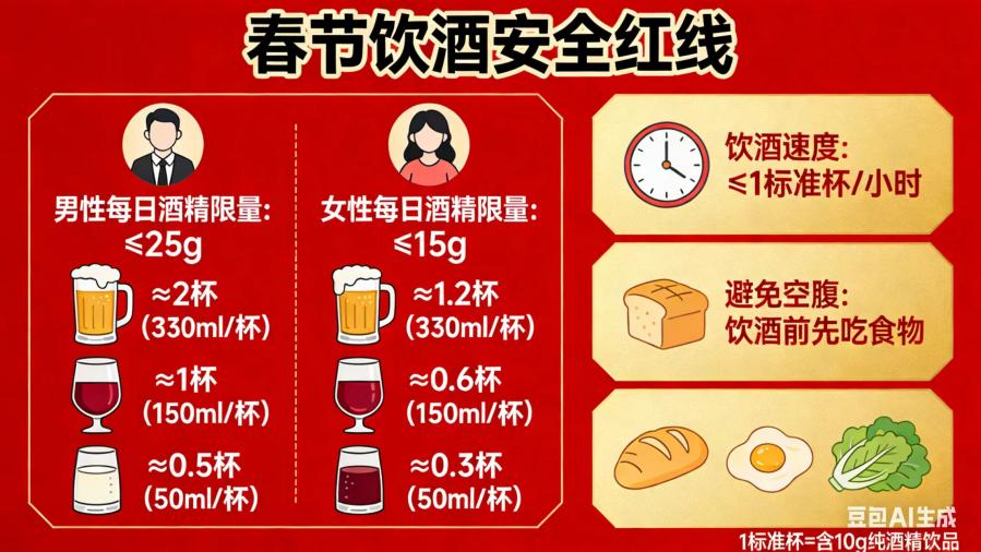 作为医护人员,我们理解春节团聚时饮酒的文化意义,不主张绝对禁酒,但强烈建议遵循以下“安全红线”: